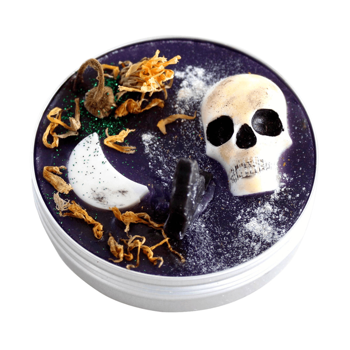 Jabón artesanal, glicerina traslucida, glicerina opaca, mica morado, mica negro, mica oro perlado, mica perla, pomadera aluminio 100g, deshidratado caléndula, molde barra gato silicón, molde luna barra silicón y molde calavera 3D silicón.