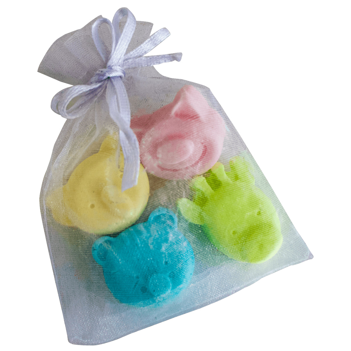 Bolsa de gaza blanca con cuatro jabones decorativos hipoalergénicos de animalitos.