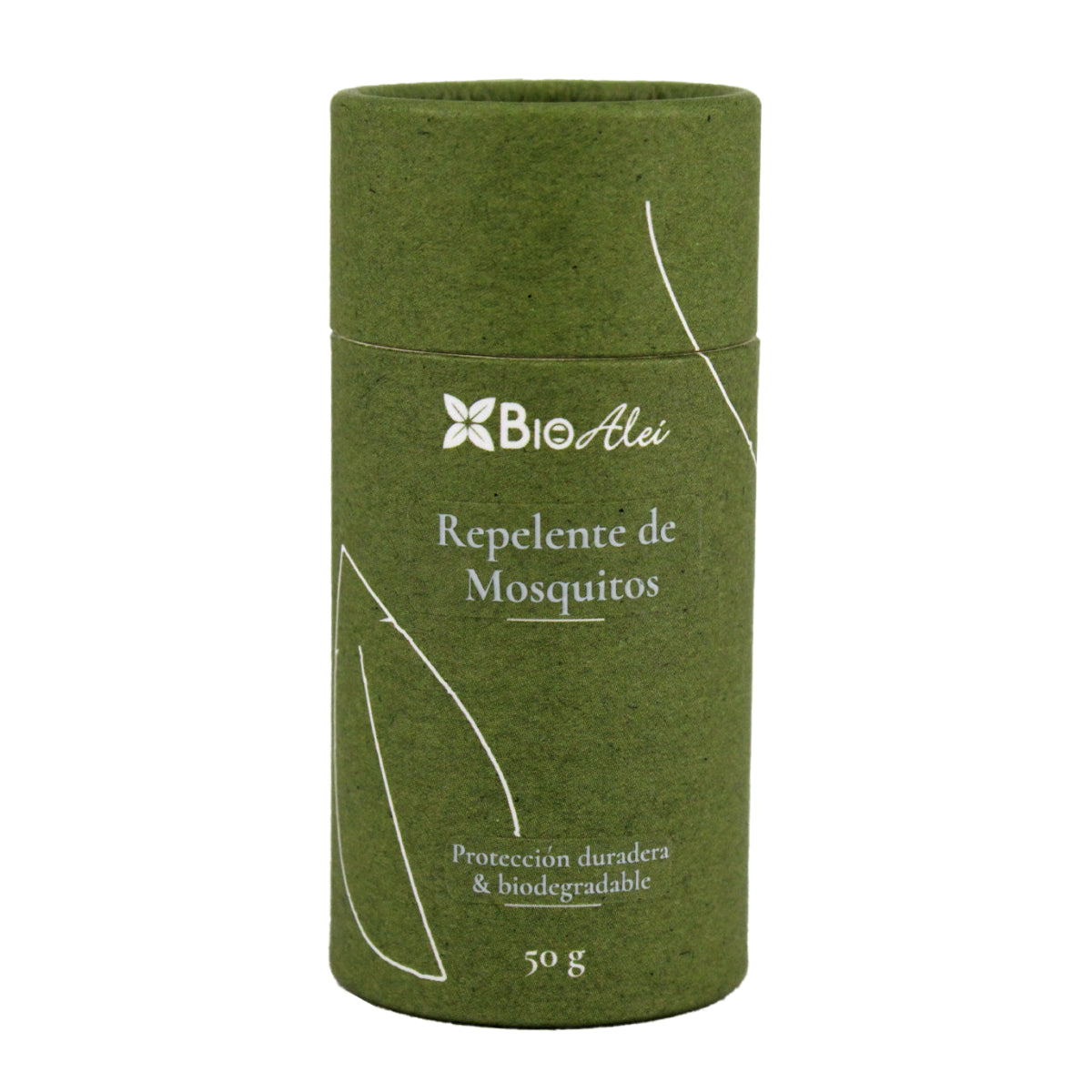 Repelente biodegradable elaborada a partir ceras y aceites naturales de coco, sésamo, aceites esenciales de árbol de té, romero y menta, con empaque ecofriendly.