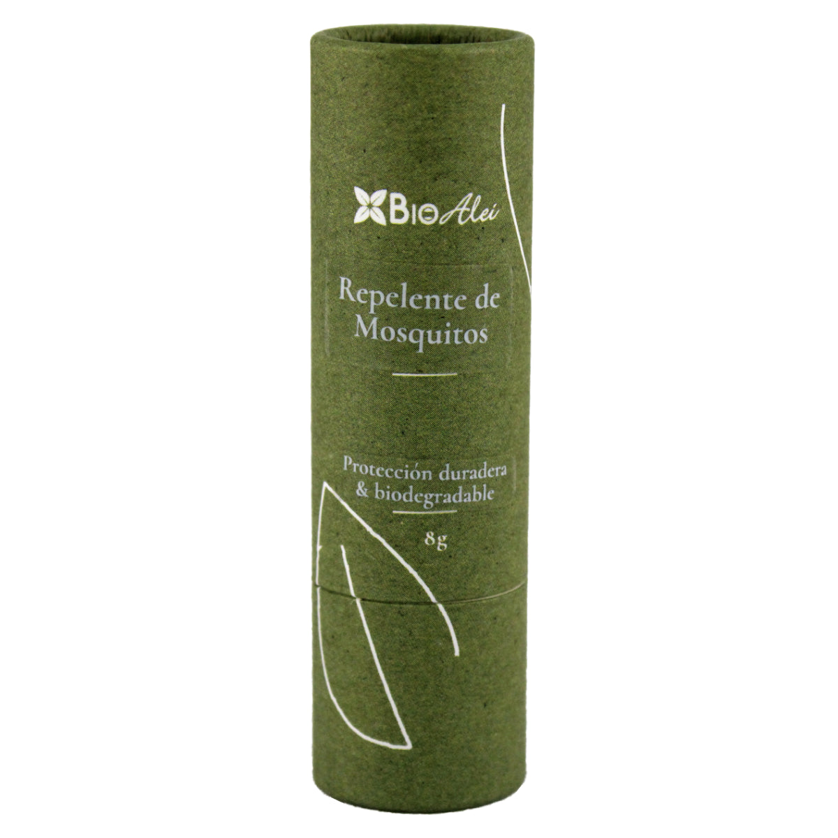 Repelente biodegradable elaborada a partir ceras y aceites naturales de coco, sésamo, aceites esenciales de árbol de té, romero y menta, con empaque ecofriendly.