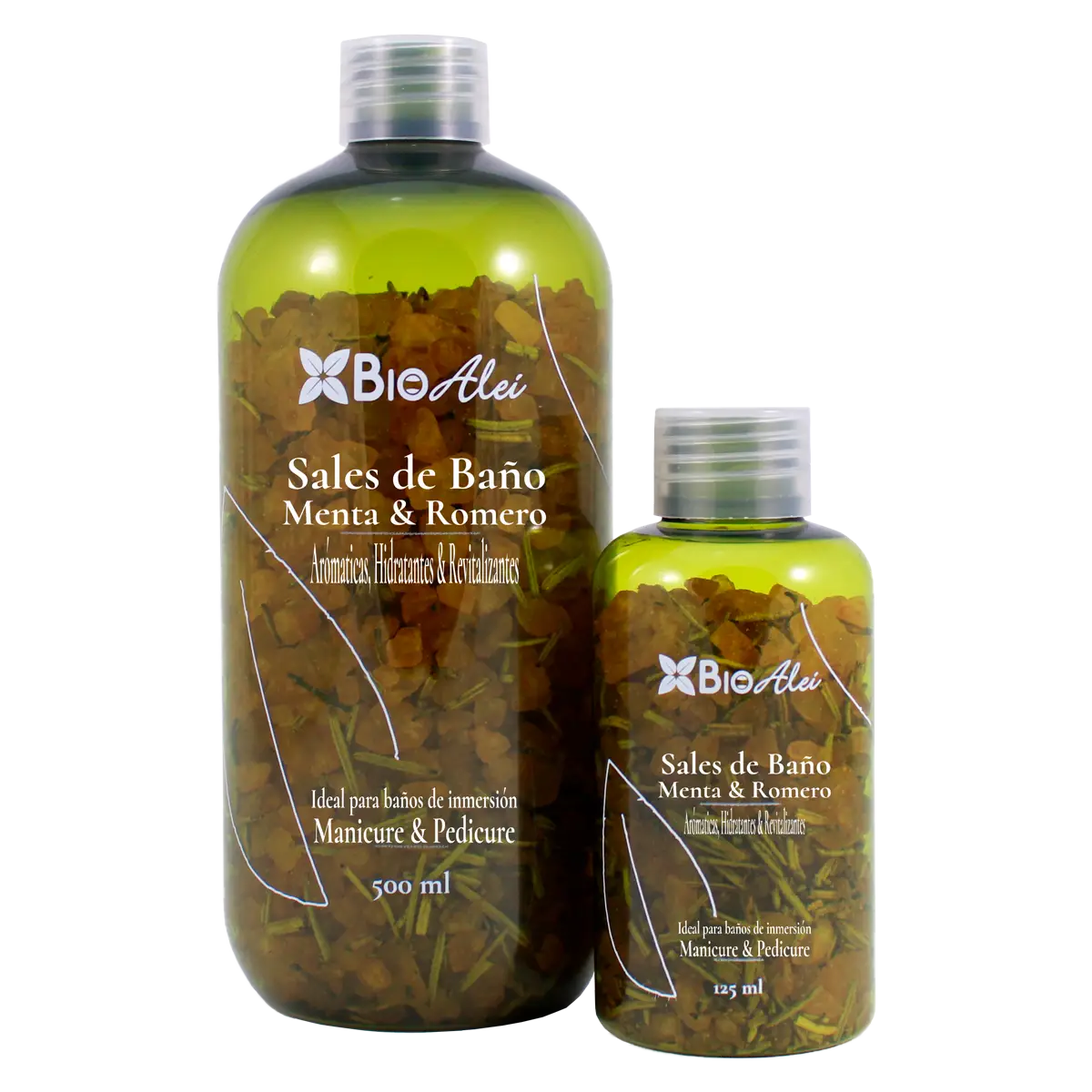 Sales aromáticas, hidratantes y revitalizantes. Aceites y exfoliantes naturales con mezcla de menta y romero.