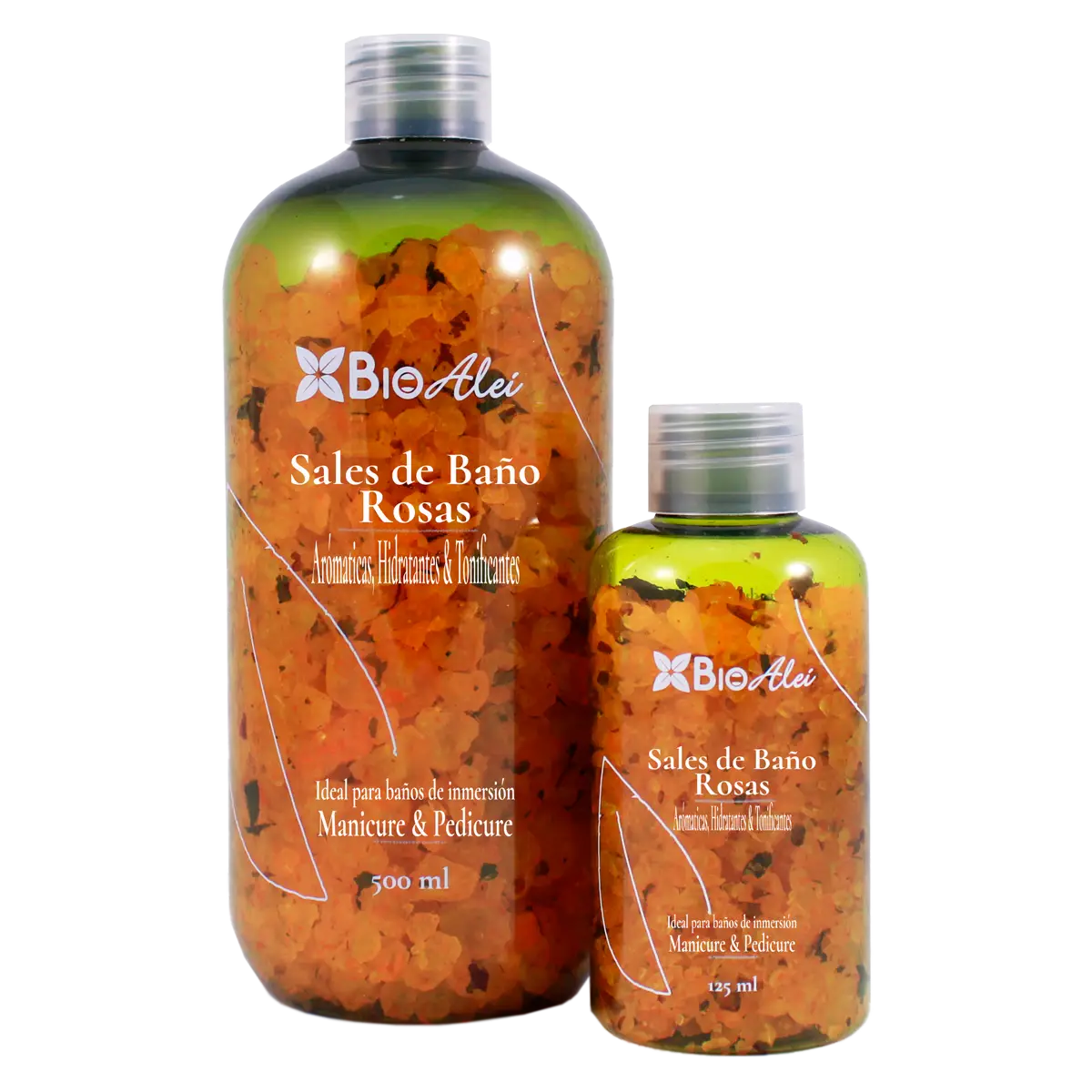 Sales aromáticas, hidratantes y tonificantes. Aceites y exfoliantes naturales elaborados con concentrado de rosas.