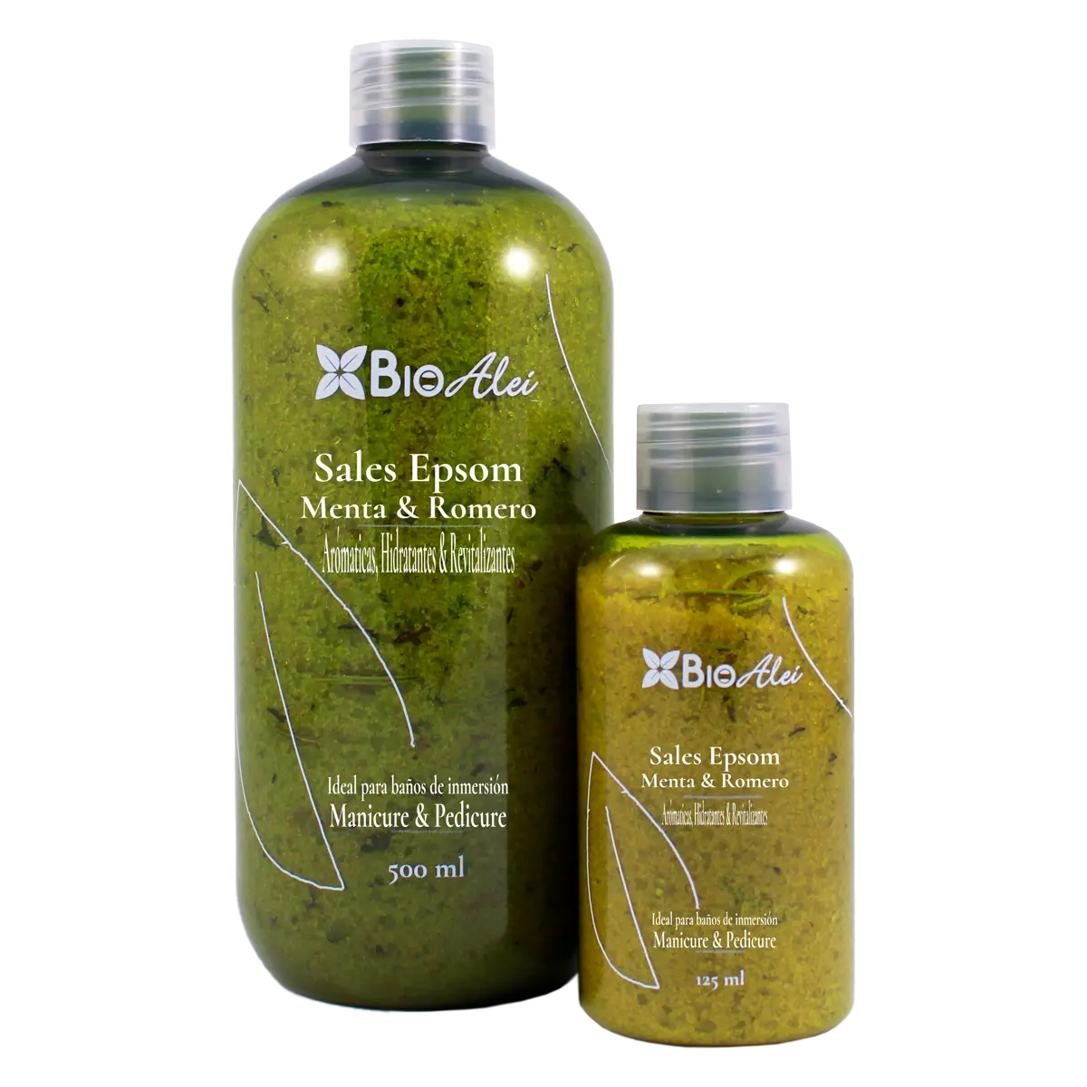 Sales aromáticas, hidratantes y revitalizantes. Aceites y exfoliantes naturales elaborados con extractos de menta y romero.