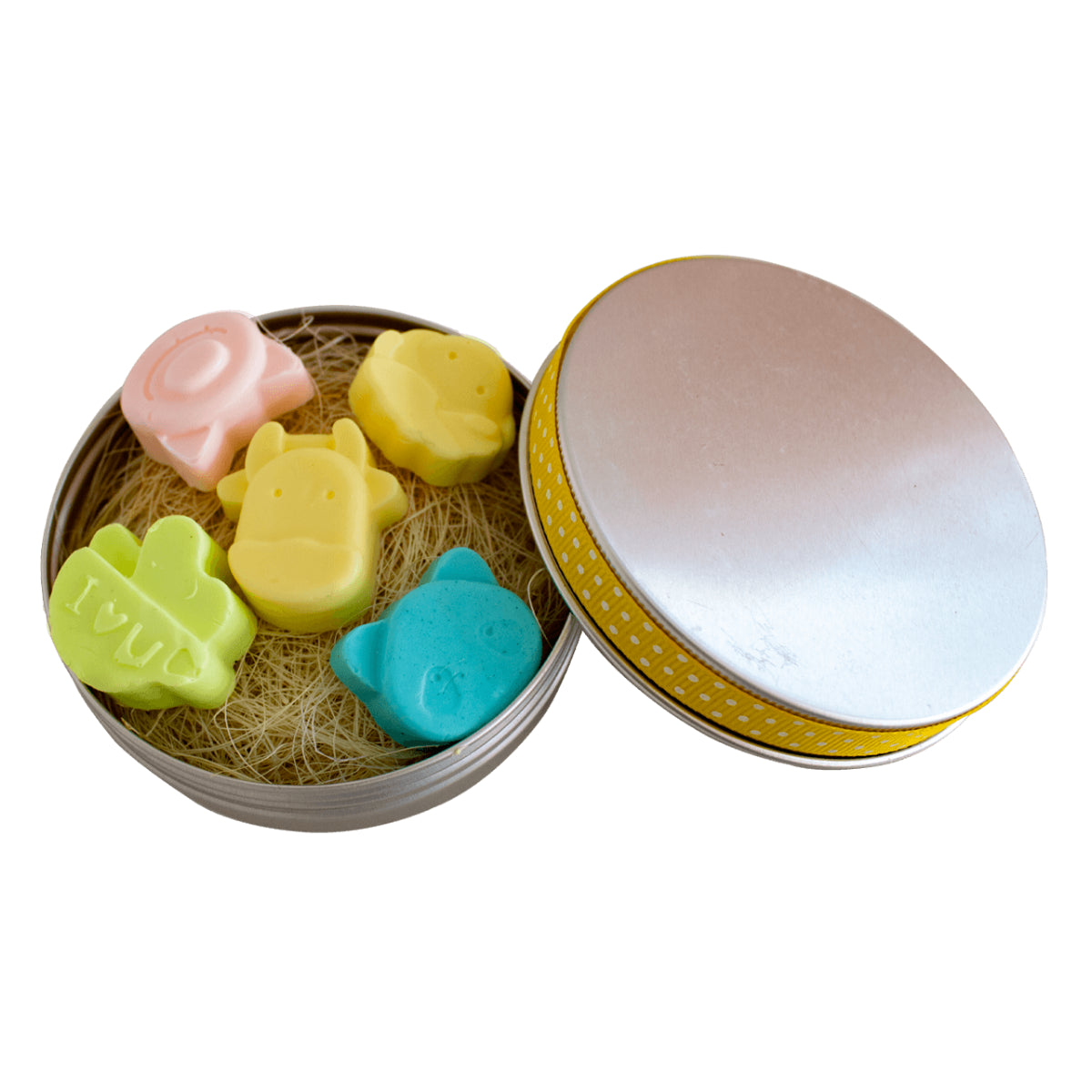 Lata de aluminio de 100g con variedad de pequeños jabones artesanales, decorativos.