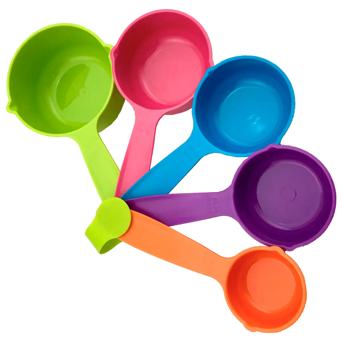 Juego de 5 tazas medidoras de diferentes tamaños y capacidades: 1/8 de taza 30 ml 1/4 de taza 60 ml 1/3 de taza 80 ml 1/2 de taza 125 ml 1 taza 250 ml. Ideal para medir ingredientes. Medidas Largo: 19 cm Ancho: 10 cm Alto: 5 cm
